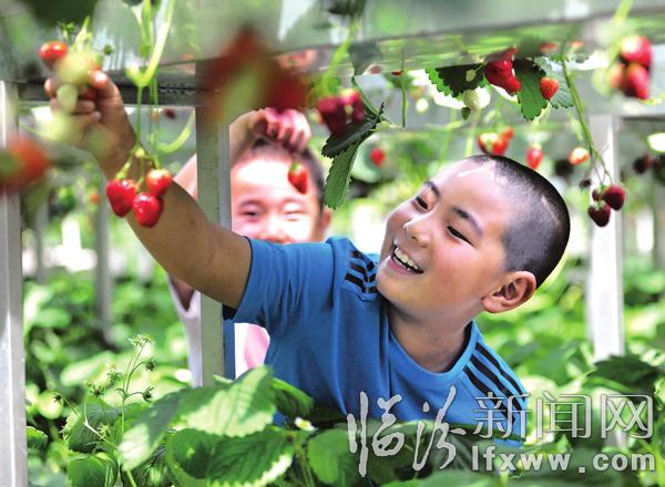 臨汾新聞網訊 5月31日,兩名兒童在家長的帶領下來到洪洞縣甘亭鎮五洲健康果蔬生產基地休閑采摘園采摘草莓。