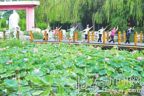 臨汾新聞網訊 時值夏日,臨汾廉政廣場里的荷花競相怒放,與水相映成趣,構成了一幅絢麗多姿的畫卷,讓人流連忘返。圖為6月28日早,市民在臨汾廉政廣場荷花園前健身、休閑。記者 盧凱 張蘊強 攝