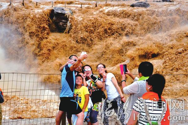 臨汾新聞網訊 7月22日,游客在吉縣黃河壺口瀑布拍照留念。當日,受陜北榆林強降雨影響,黃河晉陜峽谷多條支流出現山洪,吉縣壺口瀑布迎來入汛以來首次漲水,濁流滾滾奔騰而下,氣勢磅礴,吸引了眾多游客和攝影愛好者。