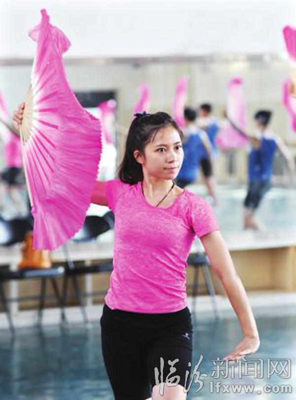 左圖:運動員在排練表演項目《桃花紅杏花白》。