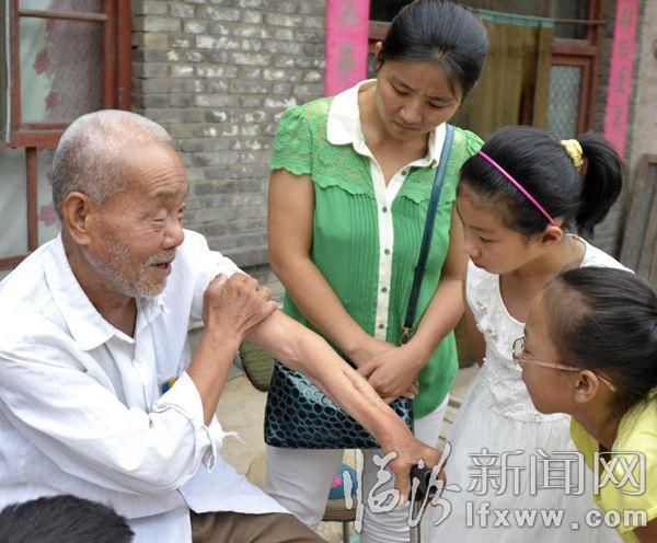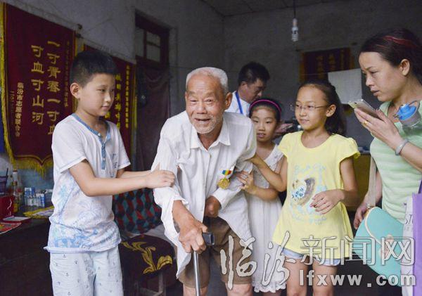 臨汾新聞網(wǎng)訊 7月29日,在“八一”建軍節(jié)來臨之際,來自臨汾市南街小學(xué)、時代風(fēng)華學(xué)校的孩子們由媽媽們帶領(lǐng)來到堯都區(qū)堯廟鎮(zhèn)下靳村看望了抗戰(zhàn)老兵梁吉孚老人,并帶去西瓜、奶粉等物品。在院子里家長和孩子們聆聽抗戰(zhàn)老兵講述戰(zhàn)爭年代的故事,讓孩子們更多的了解歷史,珍惜現(xiàn)在的生活。據(jù)了解:梁吉孚老人生于1931年,12歲當(dāng)兵(1943年),1946退役回鄉(xiāng)務(wù)農(nóng)。 孫國芳 攝