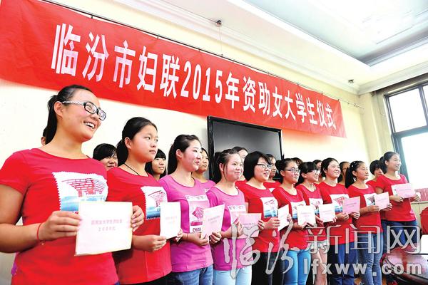臨汾新聞網訊 8月26日,受資助的女大學生們拿著愛心助學金,臉上露出了開心的笑容。當日,市婦聯舉行2015年資助女大學生儀式,為來自全市21名家庭貧困的女大學生每人資助2000元助學金和衣服,同時,在發放儀式上還舉辦勵志課堂,為她們入學前上了有意義的一堂課。 記者 閆銳鵬 攝