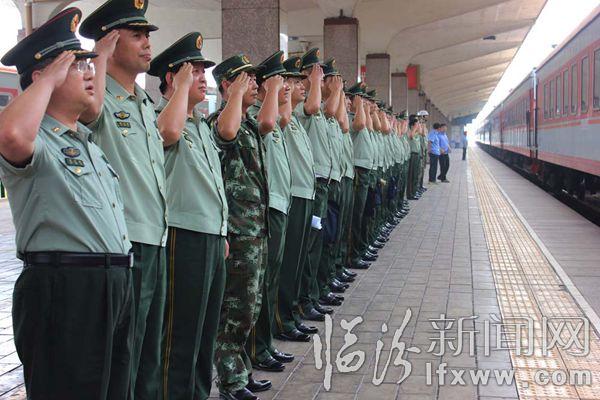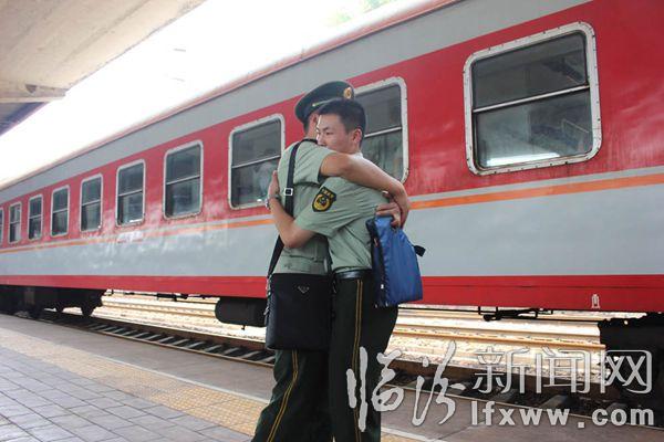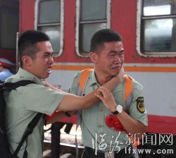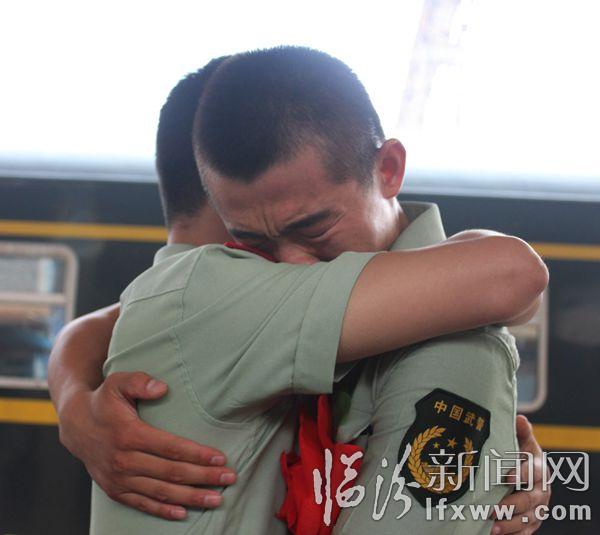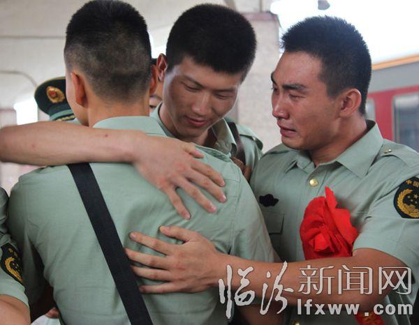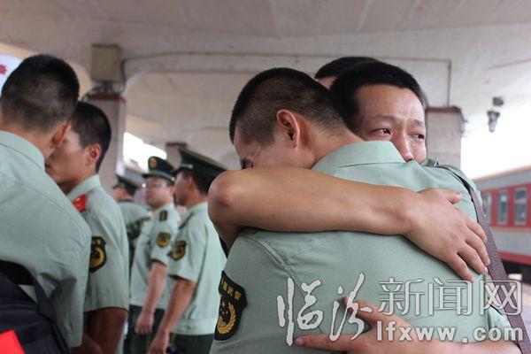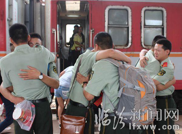 臨汾新聞網訊 9月5日12時,在臨汾火車站,臨汾市武警支隊的退伍老兵踏上返鄉的列車。退役的老兵與昔日的戰友相擁而泣、依依不舍、揮淚作別。 孫國芳 攝