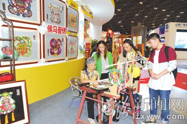 臨汾新聞網訊 9月9日,第二屆山西文化產業博覽交易會在中國(太原)煤炭交易中心隆重舉行。我市30余項參展項目向全國乃至全世界展示了臨汾的深厚文化底蘊和獨特魅力。圖為臨汾展廳內的侯馬刺繡吸引了游客駐足觀看。