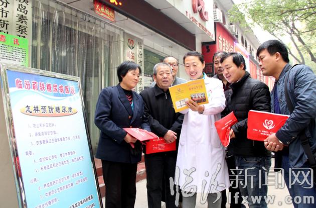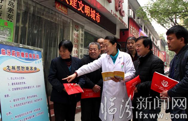 11月13日,臨汾莉軼糖尿病醫院的醫務工作者在為市民講解糖尿病的預防知識。在11月14日“世界糖尿病日來臨之際,由臨汾市糖尿病防治學會聯合臨汾市莉軼糖尿病醫院,組織了大型糖尿病防治宣傳活動,通過健康知識大講堂,進社區以及為市民建立健康檔案等形式,指導廣大市民制定科學防治方法,有效預防糖尿病。