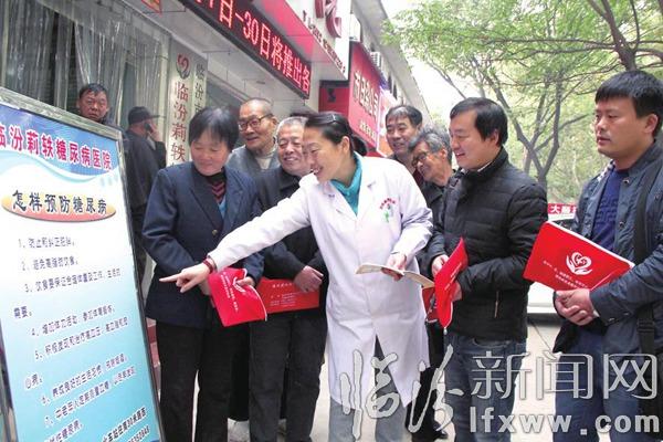 臨汾新聞網訊 在11月14日“世界糖尿病日來臨之際,市糖尿病防治學會聯合臨汾莉軼糖尿病醫院,組織開展了大型糖尿病防治宣傳活動,通過舉辦健康知識大講堂、為市民建立健康檔案等形式,指導廣大市民制定科學防治方法,有效預防糖尿病。圖為11月13日,臨汾莉軼糖尿病醫院的醫務工作者正在為市民講解糖尿病的預防知識。 本報記者 閆銳鵬 攝