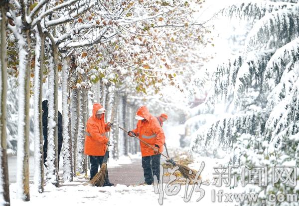 臨汾新聞網訊 11月24日,我市迎來今冬首場降雪。圖為在臨汾市濱河東路,環衛人員正在清掃道路積雪。 記者 張蘊強 攝影報道