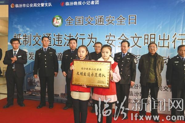 此外,由于臨汾晚報小記者團在道路交通安全教育方面所做成績比較突出,被臨汾交警支隊授予“文明交通示范團隊”。同時,臨汾交警支隊還向小記者代表頒發了《文明交通示范團隊》牌匾和《少年兒童道路交通安全執照》。