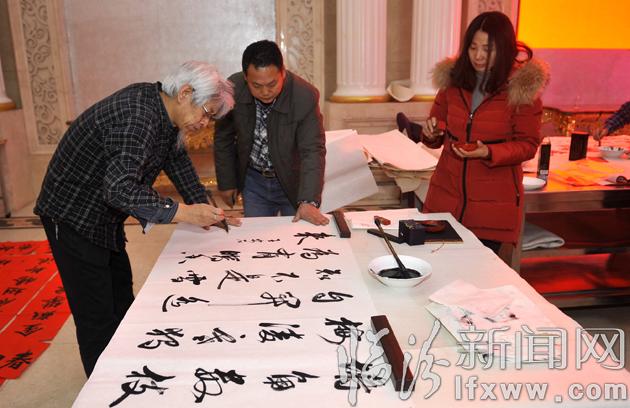 1月2日,在我市華堯集團,來自北京湖社畫會的書畫家在現場創作書畫作品。當日,山西華堯集團舉行了一場特殊的迎新春團拜會,邀請了北京湖社畫會的10余名書畫家和華堯集團600余名員工共慶新年,活動現場,書畫家結合臨汾的豐厚歷史底蘊,現場創作了巨幅山水畫卷,并為員工書寫了新年春聯,華堯集團的員工也自編自導了舞蹈、魔術以及小品等精彩的文藝節目,在濃濃的書香氣氛中,喜迎新春的到來。