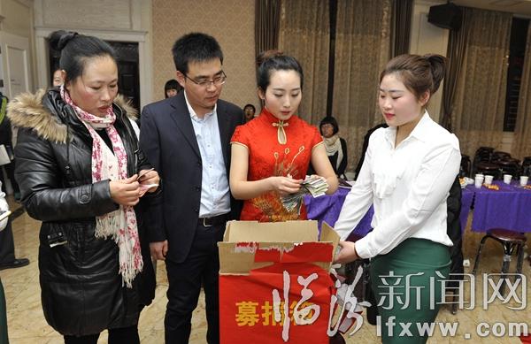 臨汾新聞網訊 1月17日,在我市三晉祥云旅游文化有限公司,員工們在為霍州白血病患者孔菲捐款。當日,該公司舉行了一場愛意濃濃的年會,為霍州16歲的白血病患者孔菲進行了一場愛心募捐,同時成立了愛心志愿者服務隊,定期開展愛心幫扶,環保公益等志愿活動,活動現場,員工們自編自導了舞蹈、詩朗誦以及互動聯歡,在濃濃的愛意迎接新春的到來。 記者 閆銳鵬