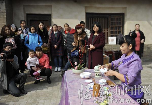 上午10點,茶會活動在丁村民俗博物館第20號院內準時開始。走進這座四合院,映入眼簾的是具有濃郁古樸風格的古建筑,在這些建筑上,不同的裝飾藝術更為吸引人。斗拱、門楣、匾額、階石、門砧石、踏石雕刻著各式各樣的人物、鳥獸、花草……出神入化的雕刻藝術為這里的古建筑增添了無窮的魅力。