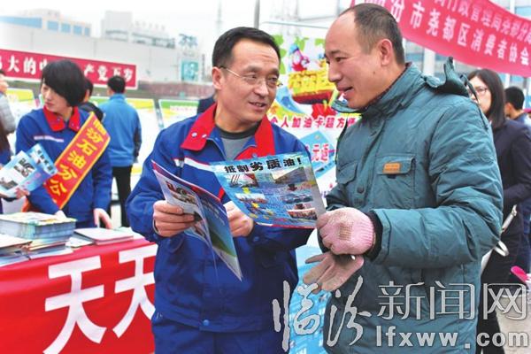 臨汾新聞網訊 3月15日,中石化臨汾分公司的工作人員向市民介紹鑒別優質與劣質汽油的方法。記者 閆銳鵬 孫國芳 攝