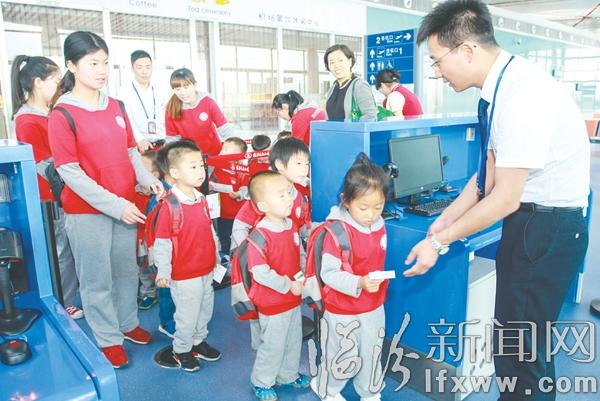 臨汾新聞網(wǎng)訊 “快看,大飛機(jī)……”在臨汾民航機(jī)場(chǎng)航站樓的玻璃墻后,孩子們激動(dòng)地喊道。5月13日,我市一家幼兒園的小朋友和老師一行40余人在航站樓工作人員的引領(lǐng)下,興致勃勃地參觀了機(jī)場(chǎng)候機(jī)樓,并體驗(yàn)了一次乘機(jī)流程。該幼兒園的帶隊(duì)老師告訴記者,此次體驗(yàn)活動(dòng),讓孩子們了解了如何辦理登機(jī)牌、托運(yùn)行李、過(guò)安檢等乘機(jī)環(huán)節(jié),同時(shí),通過(guò)工作人員的講解,讓孩子們?cè)谛闹猩钌罘N下一個(gè)“航天夢(mèng)”。記者 郝海軍 攝