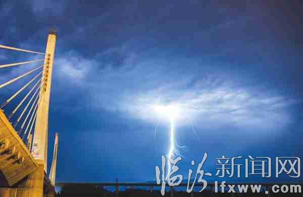 臨汾新聞網訊 6月13日20時許,在臨汾城區西南環矮塔斜拉橋上空,閃電劃破夜空。23時許,風停雨歇,月亮繁星再次出現在天空。
