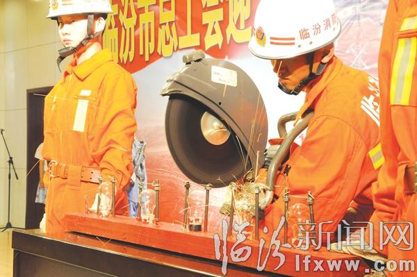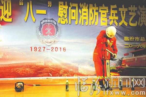 臨汾新聞網訊 7月31日,臨汾市總工會慶八一慰問消防官兵文藝演出在市消防支隊精彩上演。圖為洪洞消防中隊進行搶險救援器材展示。