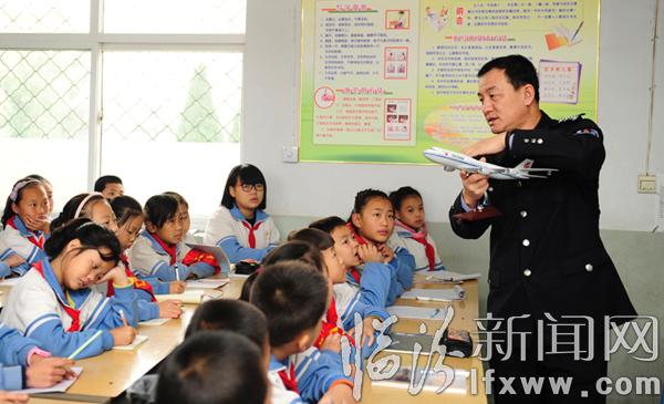 臨汾新聞網(wǎng)訊(記者 李虎威 攝 )11月9日,在臨汾市八一小學(xué),臨汾機(jī)場公安分局民警王強(qiáng)給小學(xué)生講解航空安全知識。為確保機(jī)場安全,該局在機(jī)場周邊學(xué)校開展“航空安全進(jìn)校園“”活動。