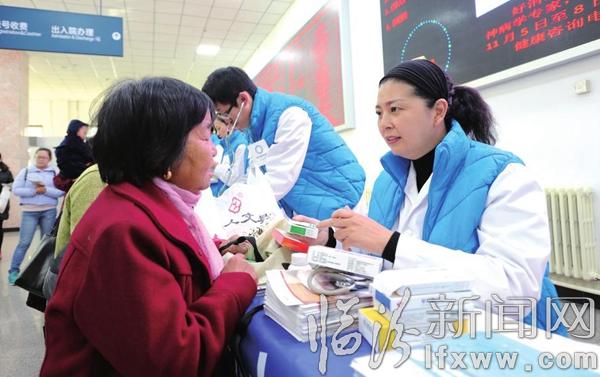 臨汾新聞網訊 11月8日,在第十個“聯合國糖尿病日”來臨之際,市中心醫院開展主題為“著眼糖尿病”的宣傳義診活動,內分泌科的醫護人員身著寓意“藍光行動”的藍色馬甲,向前來就診的市民免費檢測血糖、測量血壓,進行糖尿病篩查。活動為500余人次進行了義診,并向廣大市民宣傳了糖尿病的危害、預防措施等知識。圖為內分泌科主任孟曉萍正在為糖尿病患者義診。