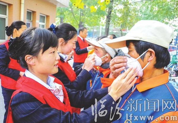 臨汾新聞網訊 11月10日,臨汾市環衛局北城環衛所內,交通銀行臨汾分行營業部的愛心志愿者為該所全體環衛工人免費發放PM2.5霧霾口罩,幫助他們抵御霧霾的“侵襲”。