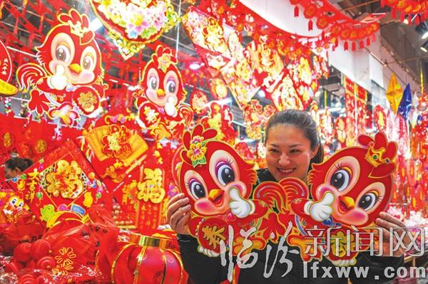 臨汾新聞網訊 隨著元旦、春節的臨近,各家飾品商鋪門庭若市,火紅的燈籠、中國結、年畫、春聯等新年裝飾品銷量大增。以雞為造型的各類生肖飾品、擺件、掛件受到消費者的青睞。圖為12月28日在新百匯,市民選擇雞年新年裝飾品。