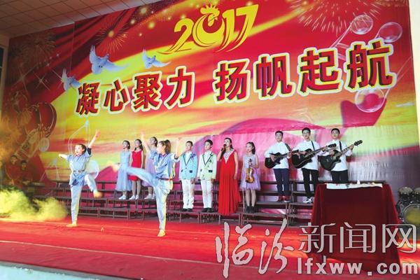 臨汾新聞網訊 12月30日晚,臨汾市第一中心學校舉辦元旦聯歡晚會,由該校教師和學生自編自演的12場精彩紛呈的節目輪番上臺進行了展示,向社會匯報了學校推行素質教育的豐碩成果。圖為該校初中部的師生同臺表演文藝節目。