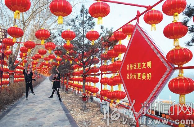 臨汾新聞網訊 春節期間,游人正在市區汾河公園景區內游玩。火紅的燈籠長廊與浮橋上懸掛著的紅色“中國結”裝飾標語交相輝映,增添了濃濃的節日氛圍,市民在游玩的同時感受到濃濃的年味和文化味。