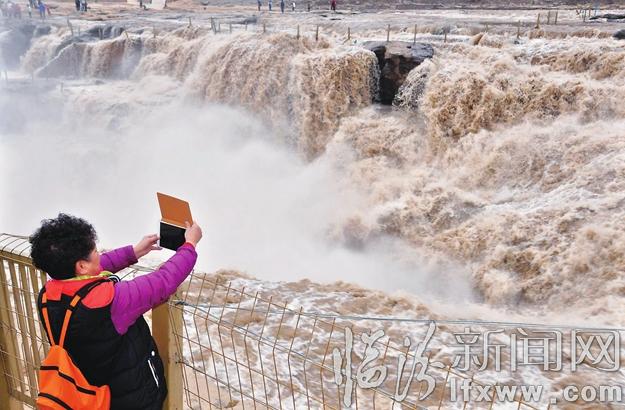 臨汾新聞網訊 3月20日,游客在吉縣黃河壺口瀑布欣賞桃花汛。