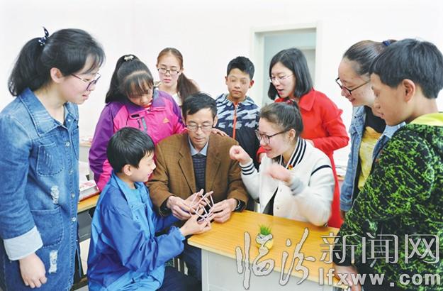 臨汾新聞網訊 4月8日,青年志愿者在和臨汾紅絲帶學校校長郭小平及孩子們一起做“翻花繩”游戲。當日,山西師范大學外國語學院“情系紅絲帶,每周一課”周末英語課堂開講,該院11名優秀青年志愿者在每個周末來到紅絲帶學校,以英語情景劇、學唱英語歌等趣味教學方式,培養孩子們英語學習興趣。