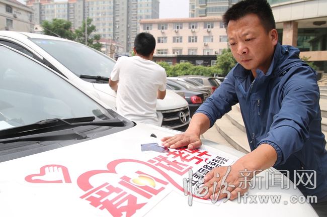 臨汾新聞網訊 團市委3000輛愛心送考車服務考生 6月6日,志愿者李民建正在張貼愛心送考車車標。當日,共青團臨汾市委組織3000余輛愛心送考車對高考學生進行一對一愛心服務。
