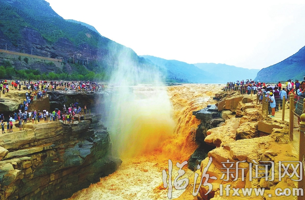 臨汾新聞網訊 8月5日,洪峰過后的黃河壺口瀑布再現雄風。在壺口岸邊遠遠就能聽見瀑布奔騰怒吼的聲音,走近壺口,只見渾濁厚重的黃河水猶如一條巨龍從天而降,扎入龍槽,翻滾出無數巨浪,咆哮向前,令無數游客嘆為觀止。據壺口景區管理部門消息,自從7月31日景區重新開放后,目前來壺口景區旅游的人數日漸增多,客流將會持續到9月初。
