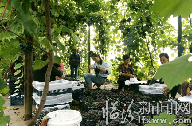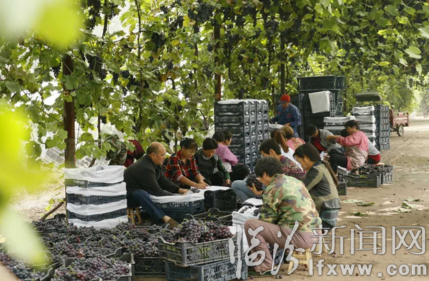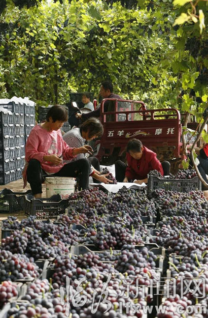 今年,基地葡萄喜獲豐收,圖為合作社農工們正在忙著采摘、分揀、裝箱,即將運銷全國多地水果市場。