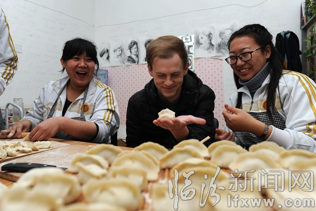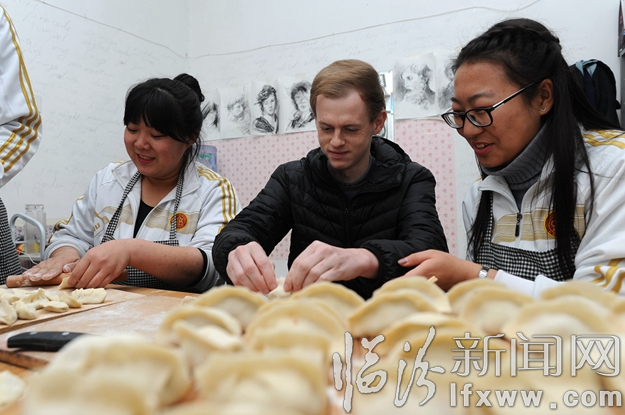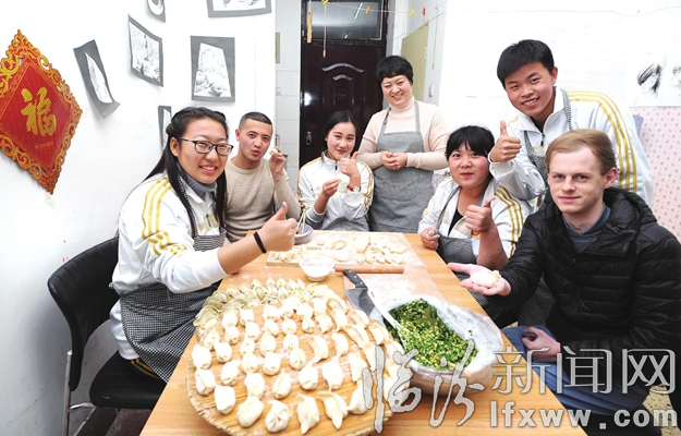 臨汾新聞網訊 12月20日,山西師范大學現代文理學院數學與計算機系,烏克蘭留學生奧斯汀(右一)、沙特阿拉伯留學生艾迪(左二)與同學們一起包餃子。冬至來臨之際,該學院數學與計算機系舉辦了“暖暖的餃子,暖暖的心”迎冬至活動,讓來自不同國家和地區的學子在分享快樂的同時,了解冬至的傳統習俗。
