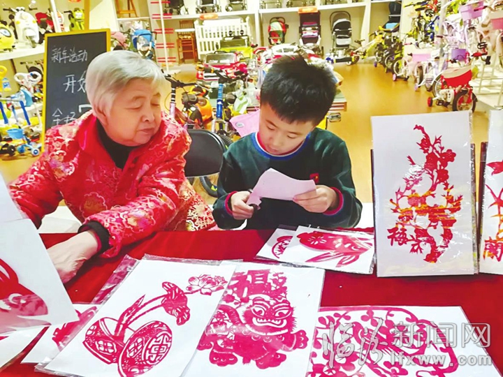 臨汾新聞網訊 春節臨近,為了讓孩子感受濃濃的年味,7日下午,一市民帶著孩子在某商場現場學習剪紙,感受傳統文化。