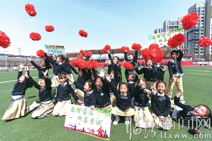 臨汾新聞網訊 3月19日,在市解放路學校,學生們在啦啦操運動中融入二青會宣傳標語。