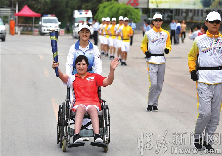 臨汾新聞網訊 5月16日,二青會火炬在吉縣、大寧傳遞。圖為來自吉縣氣象局殘疾人火炬手葛麗娟在壺口瀑布景區傳遞火炬。