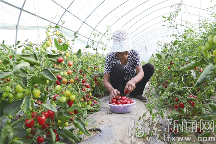 盛夏時節,堯都區段店鄉北練村和順達農業生態園的彩色番茄陸續上市。該生態園引進種植小型番茄,有紅、粉、紫3種顏色,果蔬兼備,受到市民歡迎。圖為菜農正在采摘番茄。
