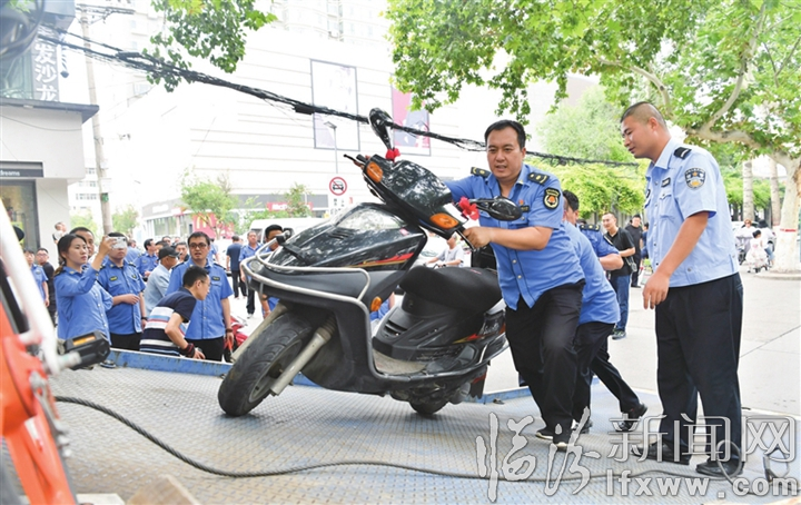 臨汾新聞網訊 8月5日,市公安局交警支隊與市城市管理局在市區聯合開展城市道路交通綜合整治暨市容衛生環境“清亂”行動,全力推進解放東西路交通秩序改善。圖為聯合執法隊員將亂停放的摩托車推上清障車。