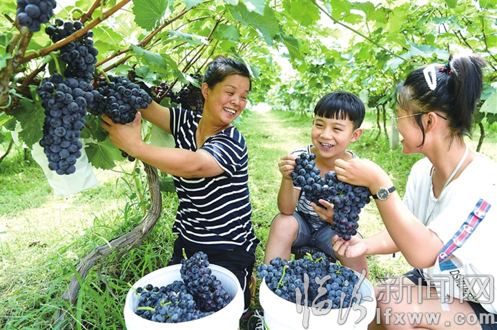 連日來,劉海燕家的葡萄采摘園里,一串串成熟的葡萄或紫或紅晶瑩剔透、綴滿枝頭,吸引了眾多游客前來采摘。