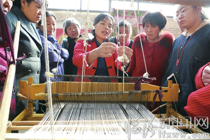臨汾新聞網(wǎng)訊 11月23日,堯都區(qū)賀家莊鄉(xiāng)政府與臨汾市鴻洪電子商務(wù)有限公司在賀家莊村共同創(chuàng)辦了就業(yè)扶貧車間。該扶貧車間主要生產(chǎn)手工編制粗布、手工藝術(shù)品,可為建檔立卡貧困戶年人均增收1.8萬元。圖為來自洪洞縣澤盛編織合作社的培訓(xùn)老師張兵兵(前中)現(xiàn)場示范織布動作。