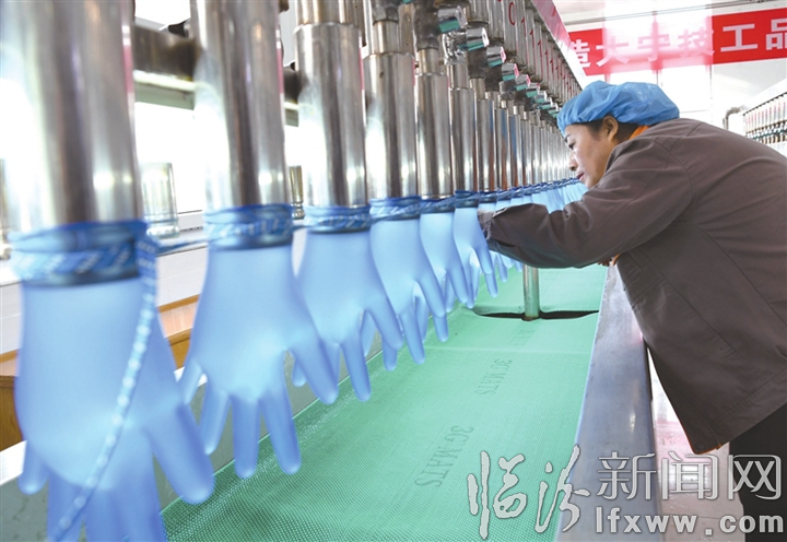 臨汾新聞網訊 大寧縣山西鴻晉塑膠科技有限公司年產40億只一次性防護手套產業扶貧項目自2017年11月建成投產以來,已吸納當地450余人就業,累計出口創匯近3000萬美元,帶動了當地的經濟發展。圖為工作人員正在檢測生產出來的一次性手套。