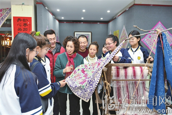 臨汾新聞網(wǎng)訊 11月23日,在市群眾藝術(shù)館,平陽印染布藝省級項(xiàng)目代表性傳承人郭素勤在向參觀者講解印染技藝。