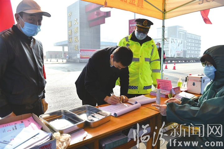 臨汾新聞網訊 2月10日,在108國道襄汾縣與堯都區(qū)接壤處,襄汾縣疾控、交警等部門工作人員在疫情防控檢查站對過往人員進行檢查登記。