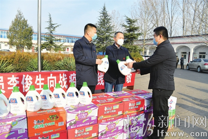 圖① 2月11日,退伍軍人、共產黨員李俊生(右)將價值6000余元的防疫物資捐贈給堯都區吳村鎮。