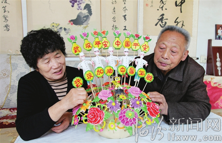 臨汾新聞網訊 3月11日,面塑藝人梁秋葉、張建中夫婦在襄汾縣景毛鄉北李村展示精心制作的面塑作品《武漢加油,中國必勝》。他們分別為省、市級“太平面塑”非物質文化遺產傳承人,從事面塑藝術制作近50年。