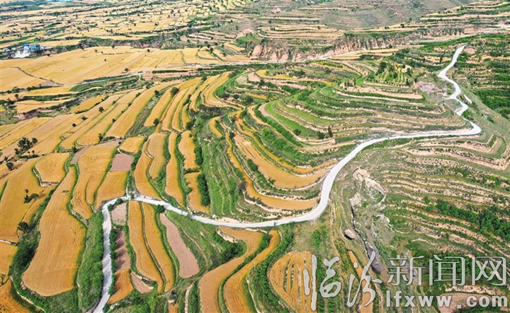 臨汾新聞網(wǎng)訊 我市小麥陸續(xù)進(jìn)入收獲期,空中俯瞰,阡陌間麥浪翻滾,如同一幅幅色彩斑斕的油畫(huà),美不勝收。圖為日前航拍的襄汾縣陶寺鄉(xiāng)金色麥田景象。