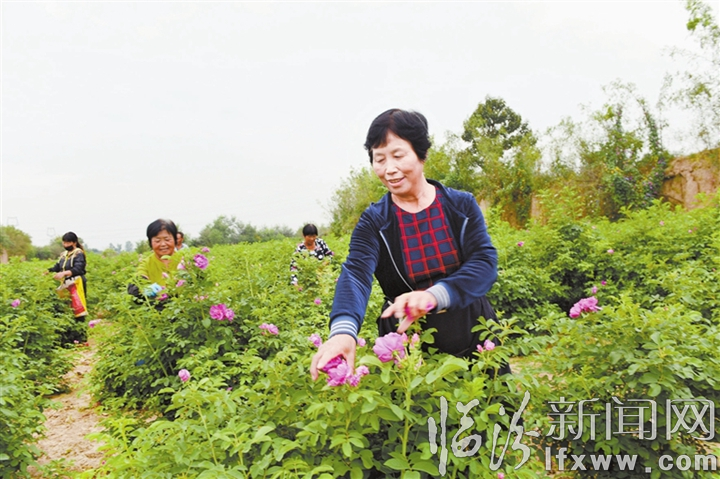 臨汾新聞網訊 9月21日,在曲沃縣委宣傳部扶貧工作隊幫扶建設的里村鎮南柴村玫瑰種植示范基地,村民正在采摘鮮花。該基地主要吸納農村貧困戶和中老年群體從事低強度的勞作,讓村民在家門口就可實現人均2000余元的月收入。