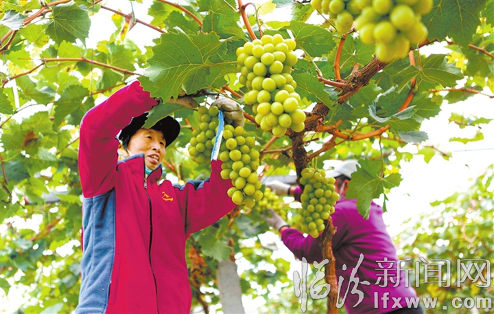 臨汾新聞網訊 近日,在襄汾縣廣奇農業生態園內,員工們正在采摘“陽光玫瑰”葡萄。近年來,該縣大力發展葡萄種植,推廣新技術,引進新品種,形成了以巨峰、夏黑、紅提、陽光玫瑰等為主導品種的多樣化和規模化種植格局,在促進葡萄產業提質增效的同時,有效帶動了當地農民增收致富。
