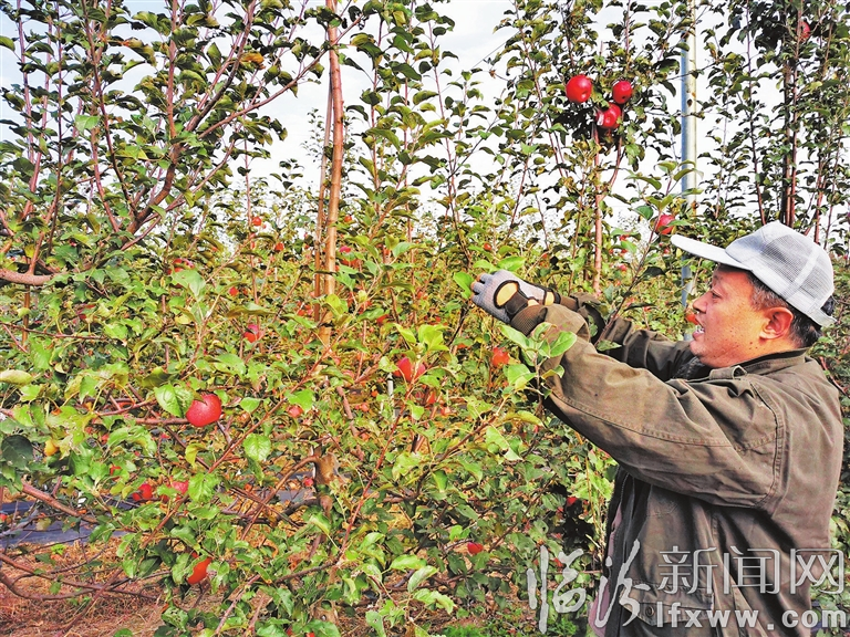 臨汾新聞網訊 金秋送爽,碩果飄香。蒲縣被子垣矮化密植果園里蒲香紅蘋果掛滿了枝頭。圖為工作人員正在采摘蘋果。