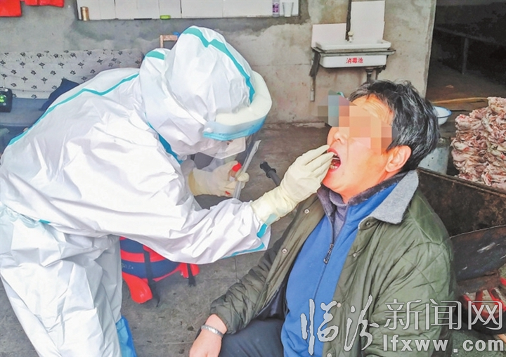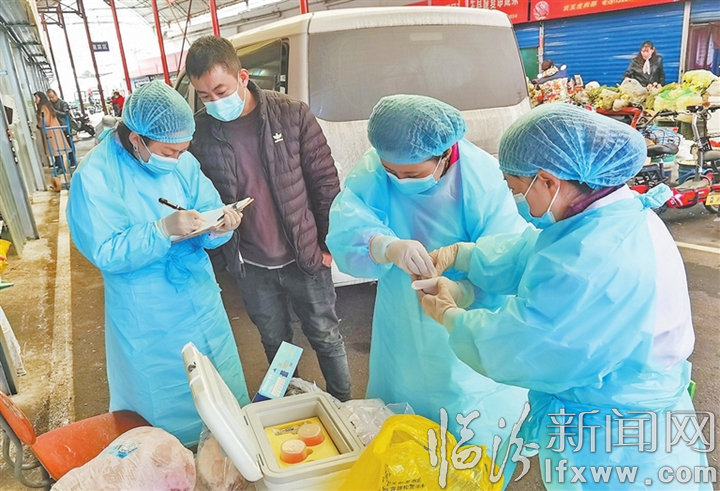 臨汾新聞網訊 11月18日,市疾控中心派出5支飛行監測隊伍,前往襄汾縣、曲沃縣、侯馬市、洪洞縣、古縣等5個縣(市、區)開展飛行監測工作。五支采樣隊伍共采集樣本81份,其中包括食品樣本34份、環境樣本41份、從業人員樣本6份,檢測結果均為陰性。圖為市疾控中心防疫人員在古縣一家農貿市場進行冷鏈食品抽樣檢測。右下圖為市疾控中心防疫人員在曲沃縣對冷鏈食品從業人員進行核酸采樣。