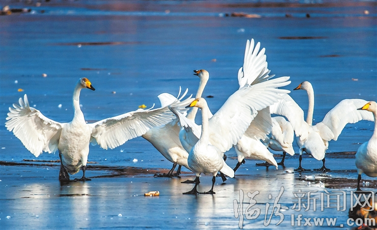 臨汾新聞網(wǎng)訊 1月21日,在洪洞縣汾河公園,一群天鵝正在嬉戲。近日氣溫回升,上百只白天鵝來到這里覓食嬉戲,成為冬日里一道美麗的風(fēng)景線。
