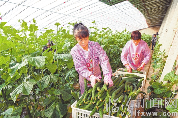 臨汾新聞網訊 1月25日,在翼城縣里砦鎮千畝智慧設施蔬菜園區李向陽的蔬菜大棚里,村民正在采摘黃瓜。該園區規劃用地1000余畝,區內道路呈“四縱兩橫”分布,規劃建設122棟日光溫室大棚,采用“黨建+園區+公司+農戶”運營模式。現已建成日光溫室大棚33棟。